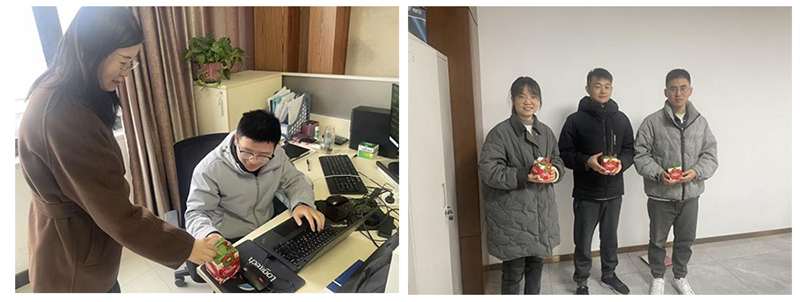 办公室员工化身 “暖心使者”,将包装精美的每一份萍果逐一摆放到每位员工的桌前,苹果上“平安快乐”四个大字格外引人注目,小小的苹果承载着绿能院对员工“平安快乐、硕果累累”的美好期许,同时彰显了绿能院对员工的关爱,也让这份“平安”祝福更具专属感。
